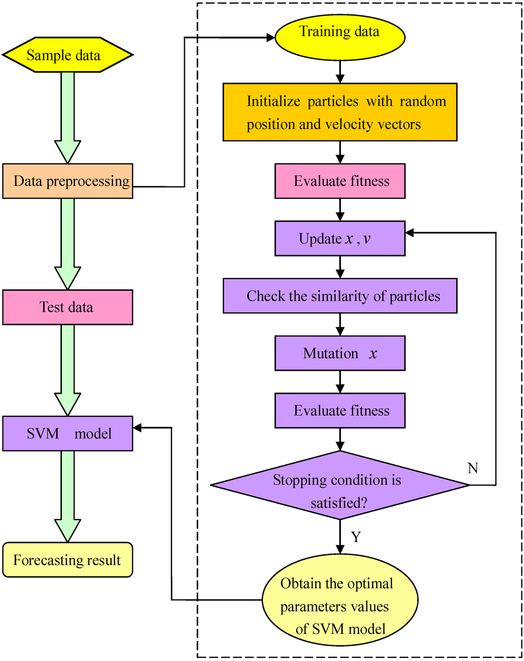 The diagram of SVM-IPSO forecasting model is illustrated in Figure 4.