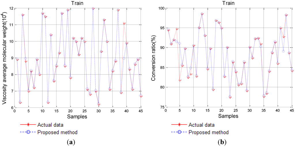 From Table 3, we can see that on the basis of MAE, the proposed SVM-IPSO achieves roughly a decrease of 98.69%, 19.48% and 6.68% compared to the other three methods, respectively. Similar results can be obtained from the other errors such as MRE with a decrease of 98.72%, 25.78% and 7.51%, RMSE with a decrease of 99.22%, 18.70% and 7.60%, and TIC with a decrease of 93.02%, 23.26% and 11.48%. Similar results are obtained on the basis of viscosity average molecular weight, conversion ratio, solid content, spinning jet drawing ratio, and coagulating bath temperature, respectively.