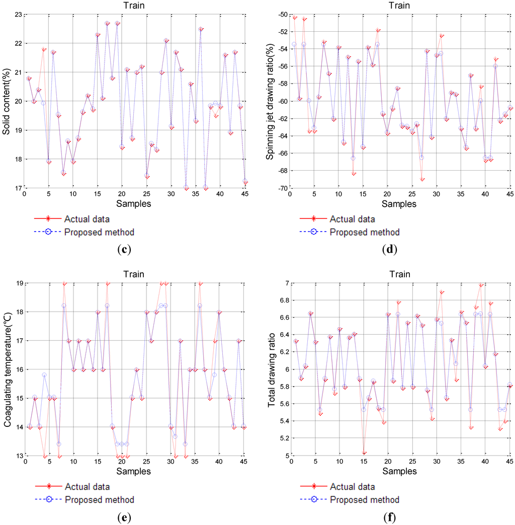Training results of the proposed SVM-IPSO model. (a) Viscosity average molecular weight; (b) Conversion ratio; (c) Solid content; (d) Spinning jet drawing ratio; (e) Coagulating temperature; (f) Total drawing ratio.