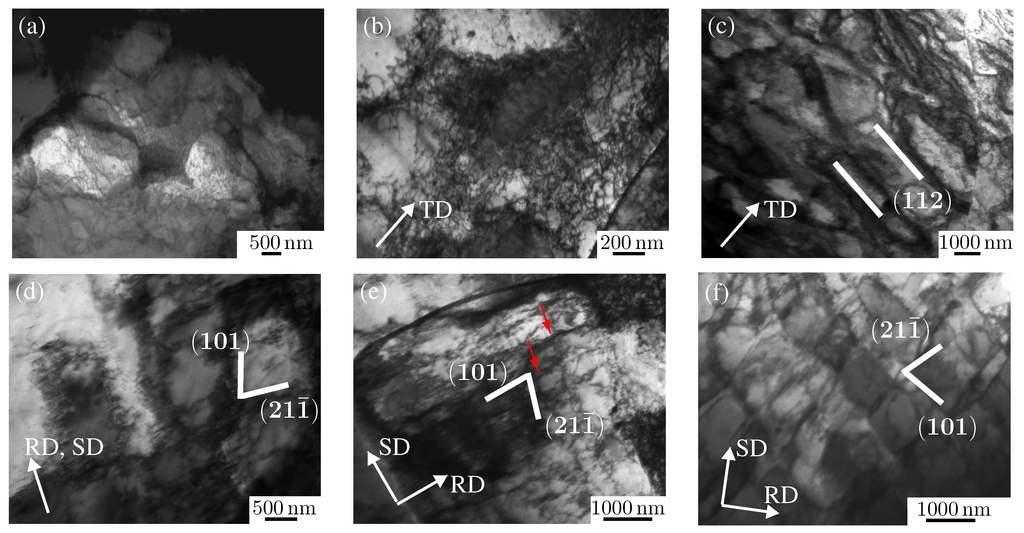 TEM images of dislocation structures of DC06: (a) as-received material; after plane strain tension up to 10% (b) and up to 20% (c) for tension in the rolling direction (RD); after 10% (d), 20% (e) and 30% (f) simple shear loading where shear direction (SD) is orthogonal to the RD. The red arrows in (e) indicate a family of dislocation walls parallel to the longitudinal direction of the grain center with a distance of about 50 nm (which is significantly smaller than the distance of 100–200 nm between single dislocation walls of other families).
