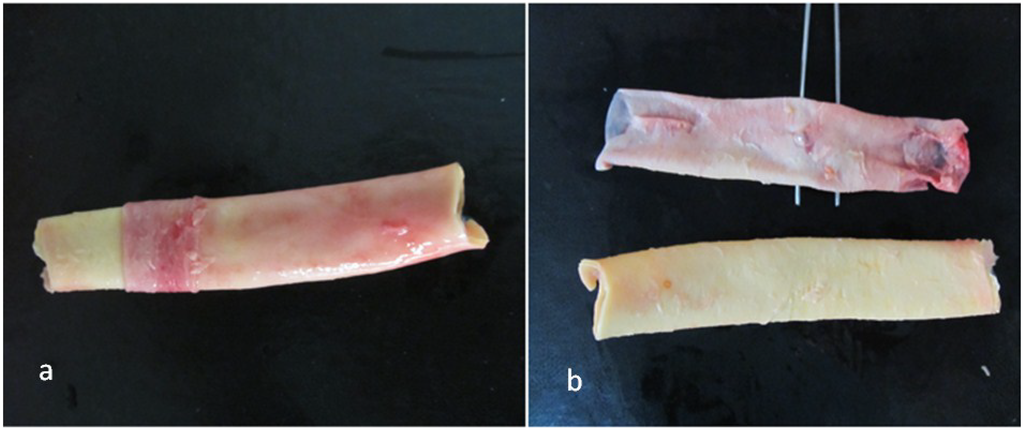 (a) Removal of adventitial tissue; (b) resulting intima-media composite and loose adventitial layer.