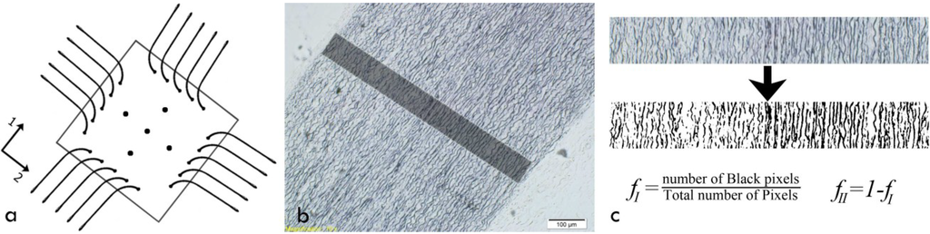 (a) A schematic of the sample under biaxial stretch; (b) Stained aortic media. Dark regions in this tissue section denote elastic fibers (Layer I), and light colored regions denote interlamellar zones, including collagen bundles, fine elastic fibers and smooth muscle cells (SMCs) (Layer II); (c) Volume fraction computation steps, including radial strip extraction, conversion to black and white and, finally, counting the number of pixels of the dark (Layer I) and light (Layer II) areas, as well as finding their proportion regarding the total number of pixels.