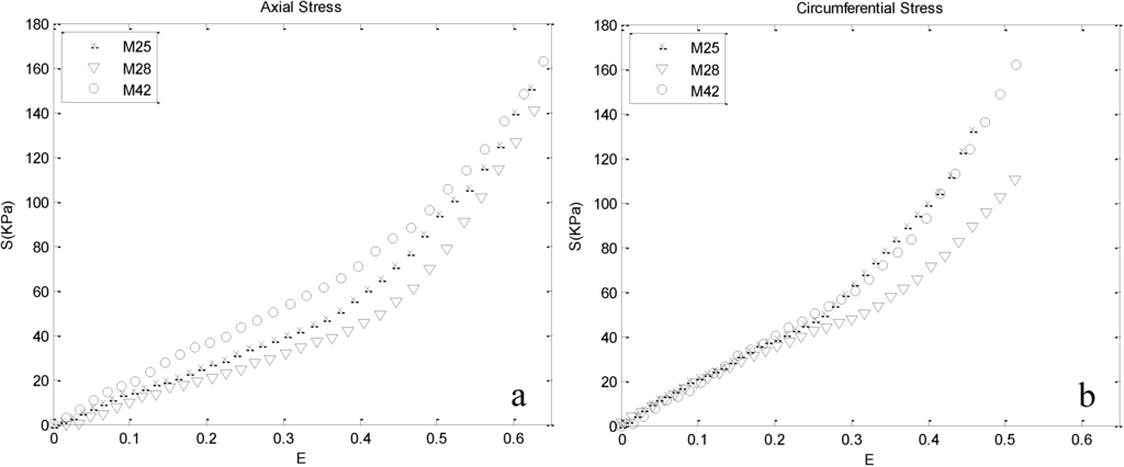 The nonlinear stress–strain responses calculated from the load-displacement data of human thoracic aorta obtained from biaxial tensile tests are depicted in Figure 3 for the axial and circumferential directions of all three test subjects. Comparing the respective strains, stiffer circumferential behavior is observed. The results indicate that in the initial part of the curves, the stress is proportionally increasing with the exerted strain up to a specific region, after which stress increases faster.