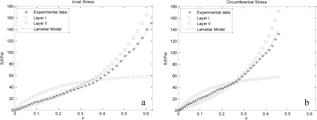 Physiologic ranges of strains in aorta are reported to be maximally 36% in the axial and 21.5% in the circumferential direction [47]. Interestingly, these strains almost coincide with the intersection points in Figure 4, indicating almost equal layer stresses in physiologic strains. In the last phase, most of the collagen fibers are recruited [48], their behavior becomes dominant and the stress-strain response of the whole media follows the contribution of Layer II.
