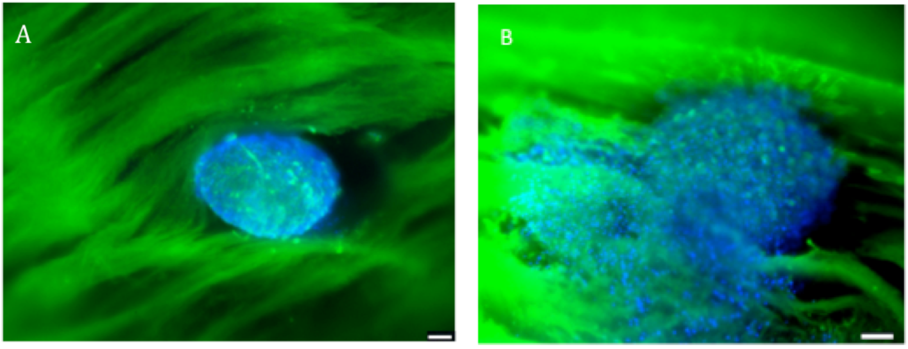 Fluorescence confocal microscopy visualization of human primary osteoblasts microtissues seeded onto the scaffold, and stained with DAPI (showing DNA) and PLL-FITC (showing the nanofibers). (A) Microtissue nesting in the scaffold at day 0; (B) Microtissue at day 3 of in vitro culture in the scaffold. Scale bar = 100 µm. n = 3.