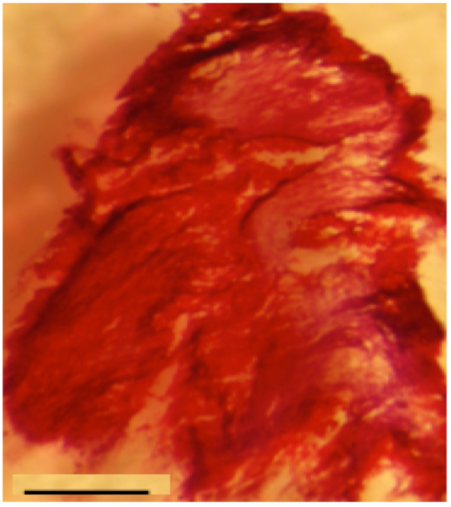 Alizarin Red staining of PCL scaffold seeded with Osteoblasts microtissues: In vitro bone induction and mineralization on the PCL electrospun nanofibers seeded with microtissues after 28 days of in vitro culture. Scale bar = 1 mm. n = 3.