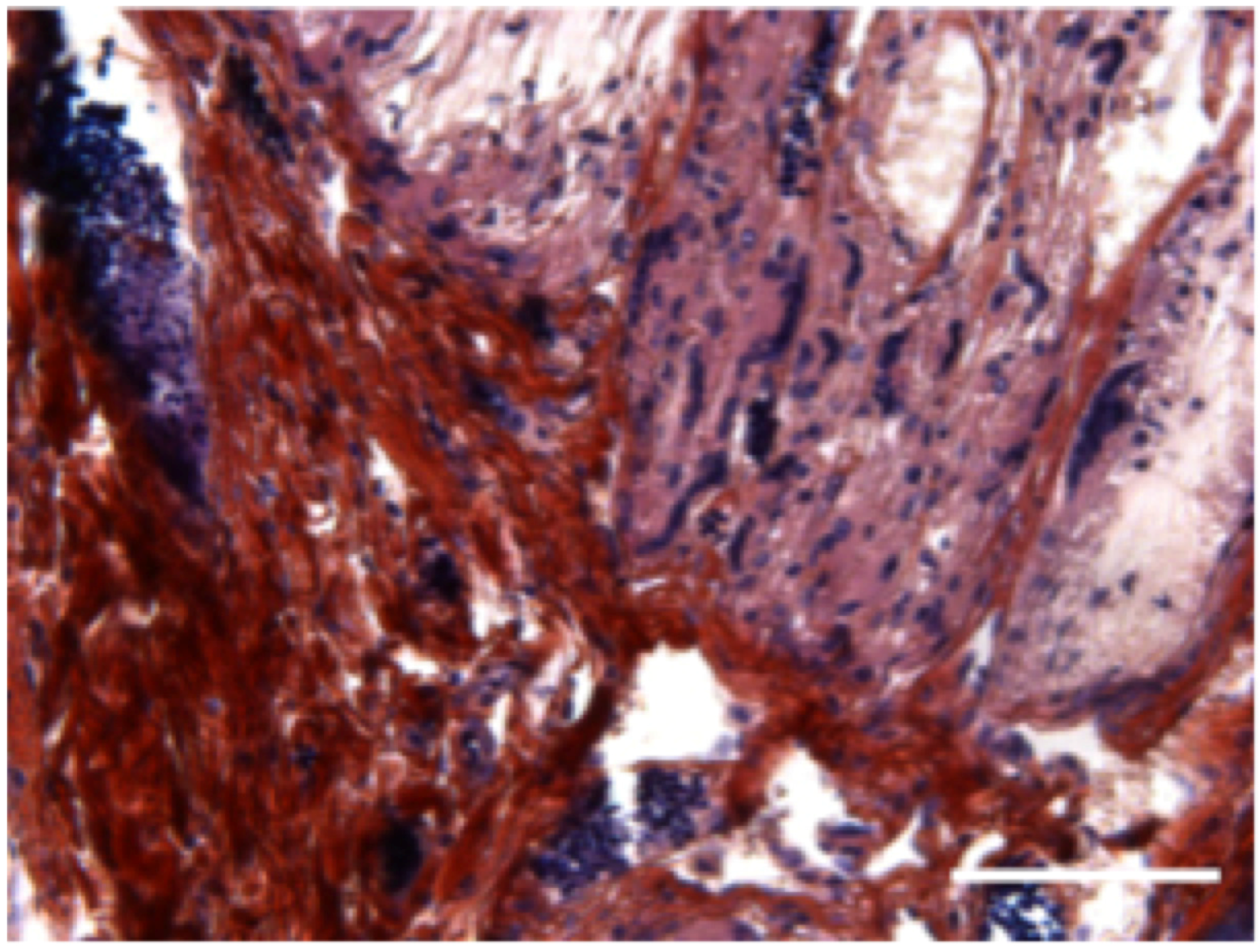 Histological analysis. The implants were fixed with Bouin Hollande solution during 2 days. Then, they were dehydrated through a series of increasing ethanol concentrations, cleared with toluene and embedded in paraffin wax. Sections were cut at 7 µm using a sledge microtome and mounted on glass slides. After the removal of paraffin wax, sections of subcutaneous implants were stained using Mallory coloration during 2 days. Number of experiments n = 3.