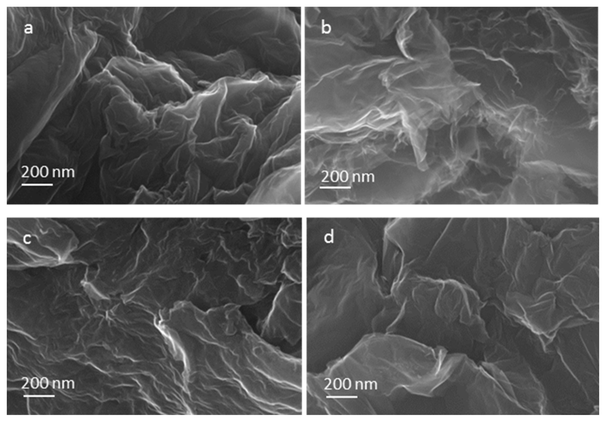 Scanning electron microscopy (SEM) images of samples with diverse doping levels. (a) Thermally exfoliated Graphene; (b) Graphene produced from precursor with mass ratio urea/GO = 0.6; (c) mass ratio urea/GO = 0.8 and (d) mass ratio urea/GO = 1.