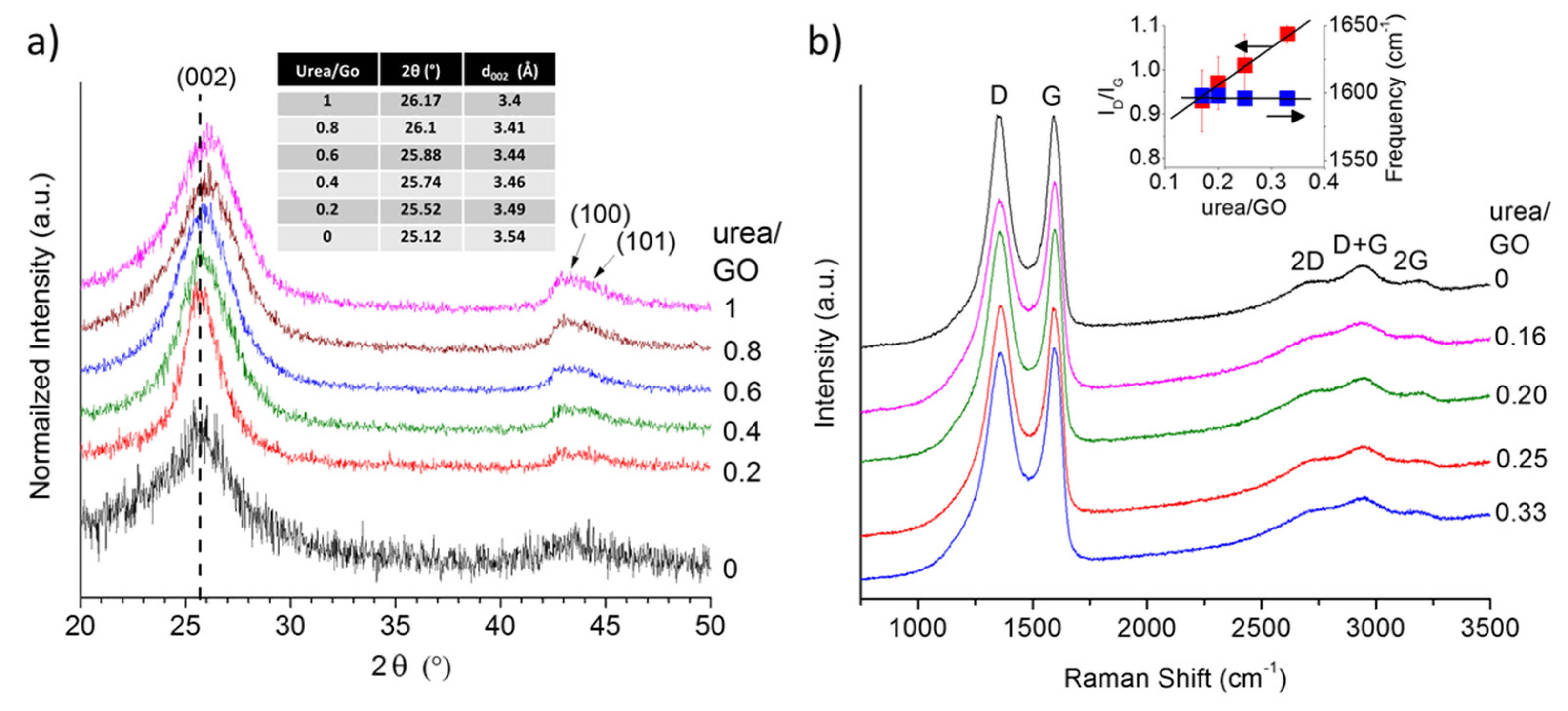 X-ray diffraction (XRD) pattern showing a shift in the d002 peak toward higher angles as the urea/GO ratio in the precursor increases (a) and Raman spectra (b) of urea/GO-derived samples in comparison to thermally exfoliated graphene. The Raman intensity ratio between D and G band, ID/IG, increases with increasing urea content while the G band position remains nearly unchanged (right insert).
