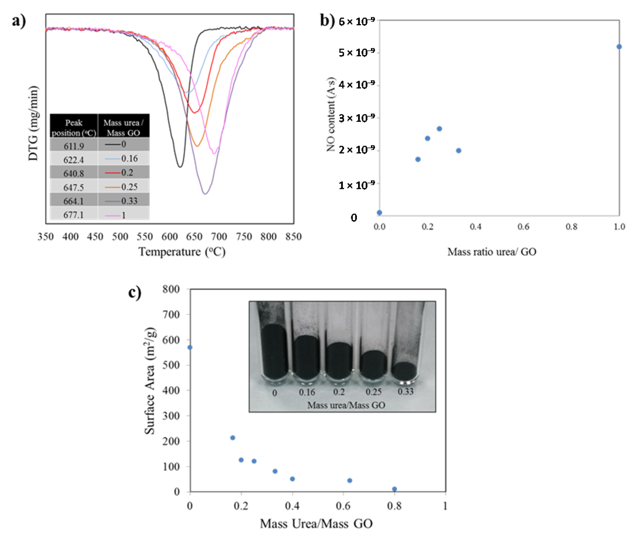 (a) Derivative (DTG) curve of the weight loss observed during the samples burn off process shifts to higher temperatures as the amounts of nitrogen introduced in the structures increase; (b) Corresponding mass spectroscopy data recorded during burn-off (mass 30). The measured ion current was normalized to the sample weight to account for differences in sample mass; (c) Variation in surface area values as the mass ratio of urea/GO increase. The same mass of sample for diverse formulations show a significant difference in mass volume.