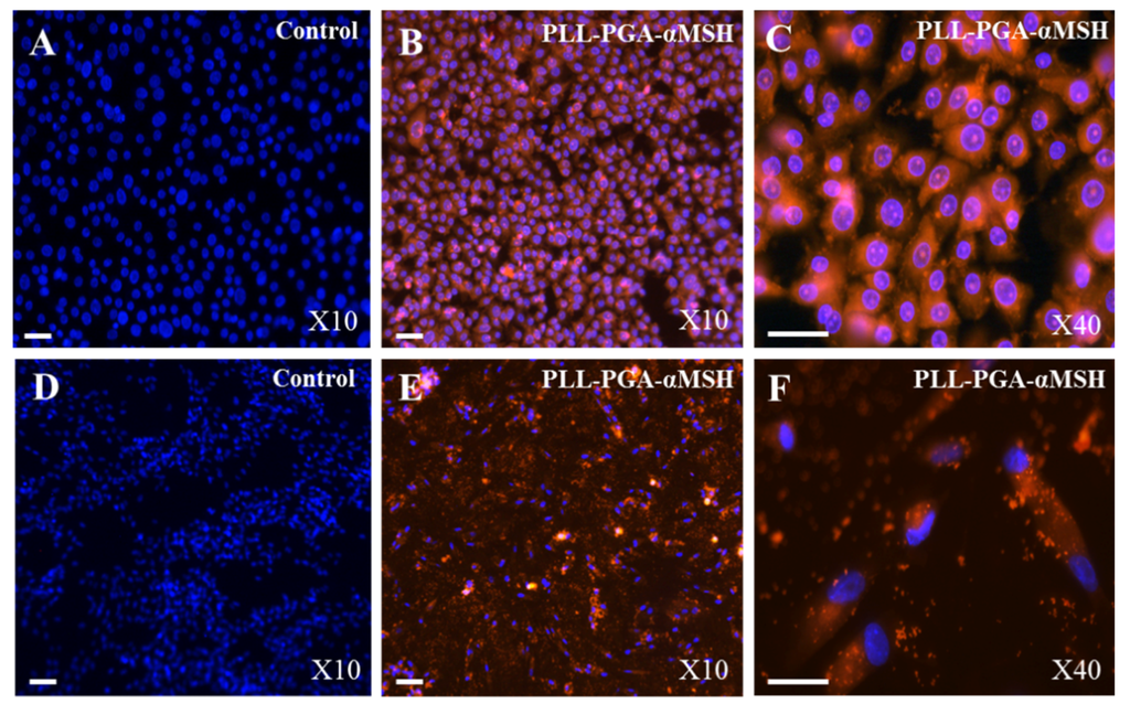 Immunolocalization of alpha-melanocyte stimulating hormone coupled to poly-L-glutamic and poly-L-lysine acid (PLL-PGA-α-MSH). Immunofluorescent analysis of human oral epithelial cells (A–C) and fibroblasts (D–F), using PLL-PGA-α-MSH conjugated to rhodamine Red after 24 h. Blue pseudocolor = DAPI (fluorescent DNA dye). All the images were imaged under the same magnification and the scale bar in all the images represents 30 μm.