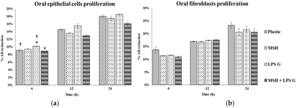 Human oral epithelial cells (a); and fibroblasts (b) proliferation. Proliferation of human oral epithelial cells and fibroblasts were analyzed after 6, 12 and 24 h on cell cultures (n = 4). These different conditions have been measured by using AlamarBlue test. Data are expressed as mean ± SD. †: difference between non-stimulated and stimulated cells, p < 0.05, *: difference between stimulated cells with or without PGA-α-MSH, p < 0.05.