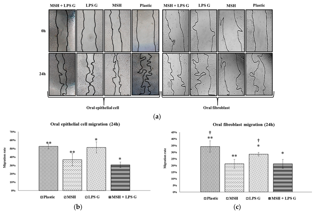Human oral epithelial cells and fibroblasts migration. Representative images of scratch closure in the in vitro scratch assay (a). Quantification of human oral epithelial cells (b) and fibroblast migration (c) at 24 h on cell cultures (n = 5). Data are expressed as mean ± SD. †: difference between non-stimulated and stimulated cells, p < 0.05; **: difference between non stimulated cells with or without PGA-α-MSH; *: difference between stimulated cells with or without PGA-α-MSH, p < 0.05.