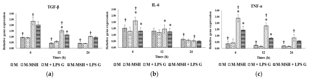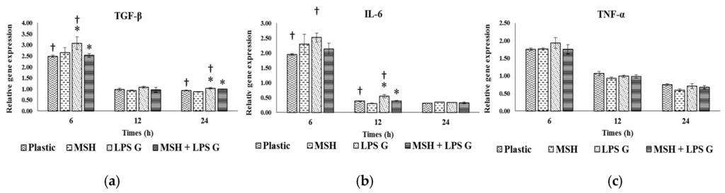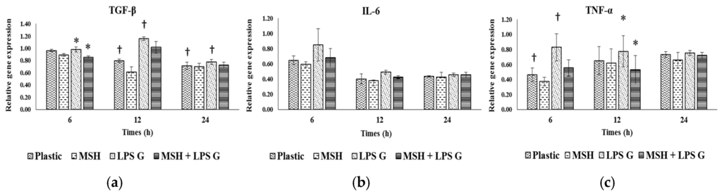 Gene expression of TGF-β (a); IL-6 (b); and TNF-α (c) in human oral epithelial cells with PCL membranes. Relative mRNA levels were analyzed by real-time quantitative RT-PCR for IL-6, TGF-β and TNF-α in EC after 6, 12 and 24 h on PCL cultures (n = 4). Data are expressed as mean ± SD. †: difference between non-stimulated and stimulated cells, p < 0.05; *: difference between stimulated cells with or without PGA-α-MSH, p < 0.05.