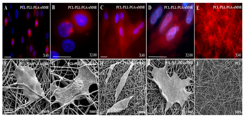 Immunofluorescent and Scanning Electron Micrograph (SEM). Analysis of human oral epithelial cells (A,B,F,G), and fibroblasts (C,D,H,I) on poly-ε-caprolactone (PCL) membrane functionalized by PLL-PGA-α-MSH after 24 h. PCL membranes is used as the control (E,J). PLL-PGA-α-MSH is conjugated to rhodamine Red. Blue pseudocolor = DAPI (fluorescent DNA dye). All the images were imaged under the same magnification and the scale bar in immunofluorescent images represents 30 μm and 5 µm (5000×), 10 µm (2000×), 20 µm (1000×) for the SEM images.