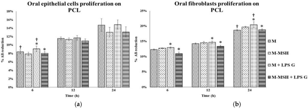 Human oral epithelial cells (a); and fibroblasts (b) proliferation with PCL membranes. Proliferation of human oral epithelial cells and fibroblasts were analyzed after 6, 12 and 24 h on PCL cultures (n = 4). These different conditions have been measured by using AlamarBlue test. Data are expressed as mean ± SD; †: difference between non-stimulated and stimulated cells, p < 0.05; *: difference between stimulated cells with or without PGA-α-MSH, p < 0.05.