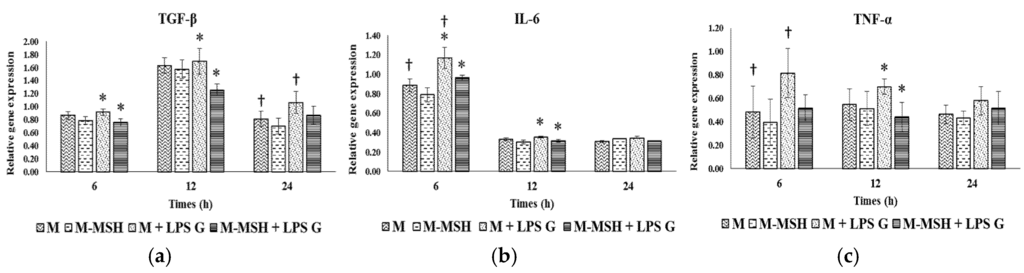 Gene expression of transforming growth factor-beta (TGF-β) (a); interleukin-6 (IL-6) (b); tumor necrosis factor (TNF-α) (c) in human oral epithelial cells. Relative mRNA levels were analyzed by real-time quantitative RT-PCR for IL-6, TGF-β and TNF-α in EC after 6, 12 and 24 h on cell cultures (n = 4). Data are expressed as mean ± SD. †: difference between non-stimulated and stimulated cells, p < 0.05; *: difference between stimulated cells with or without PGA-α-MSH, p < 0.05.