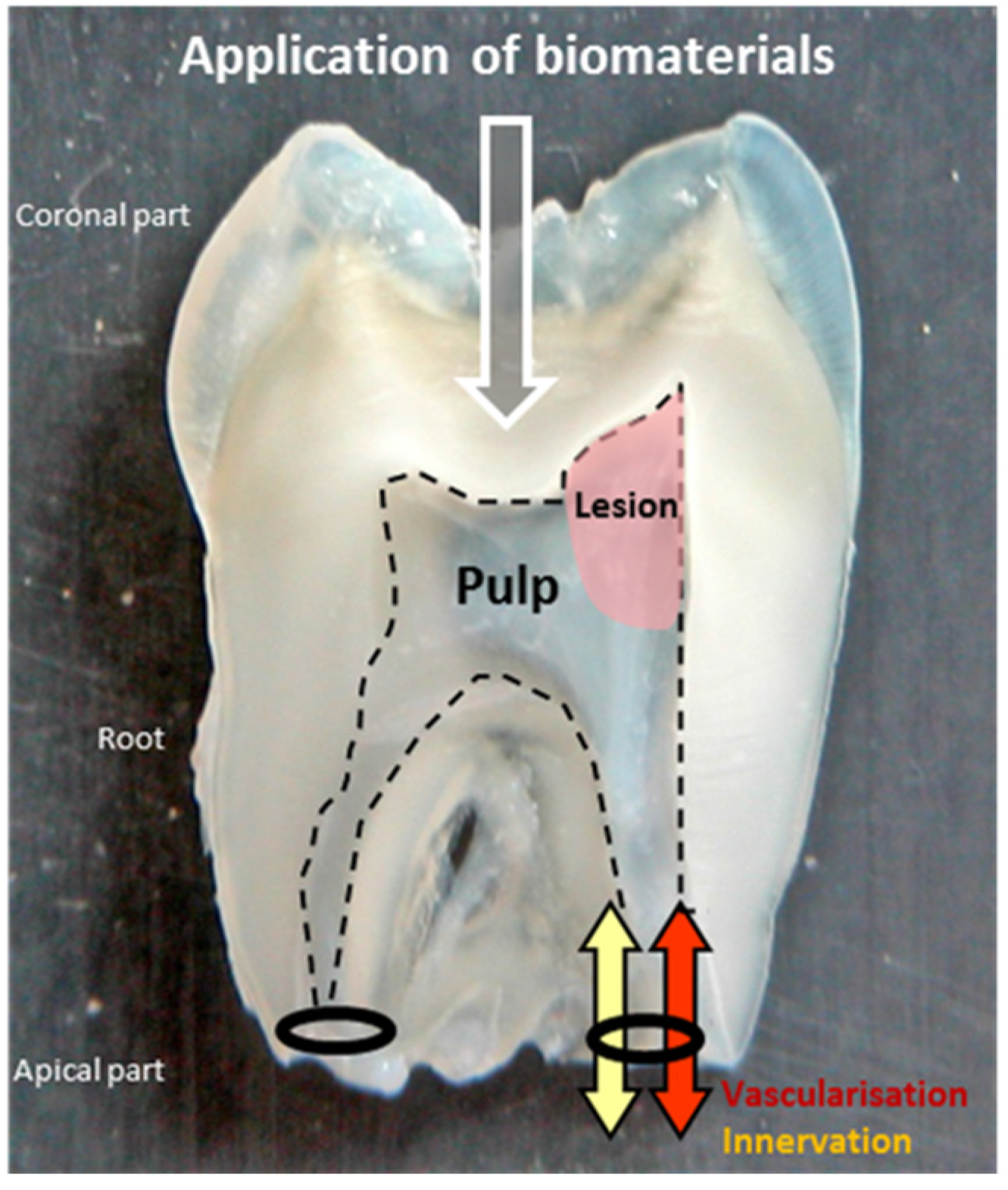 Section of an extracted tooth. The pulp is in the endodontic space delimitated by the odontoblast layer (dotted line). Its inflammation is a complex process difficult to dissipate due to its confinement in a hard chamber and its unique blood irrigation and lymphatic circulation from the apical part. Biomaterials can be applied by the coronal side to regenerate the injured tissue of the lesion.