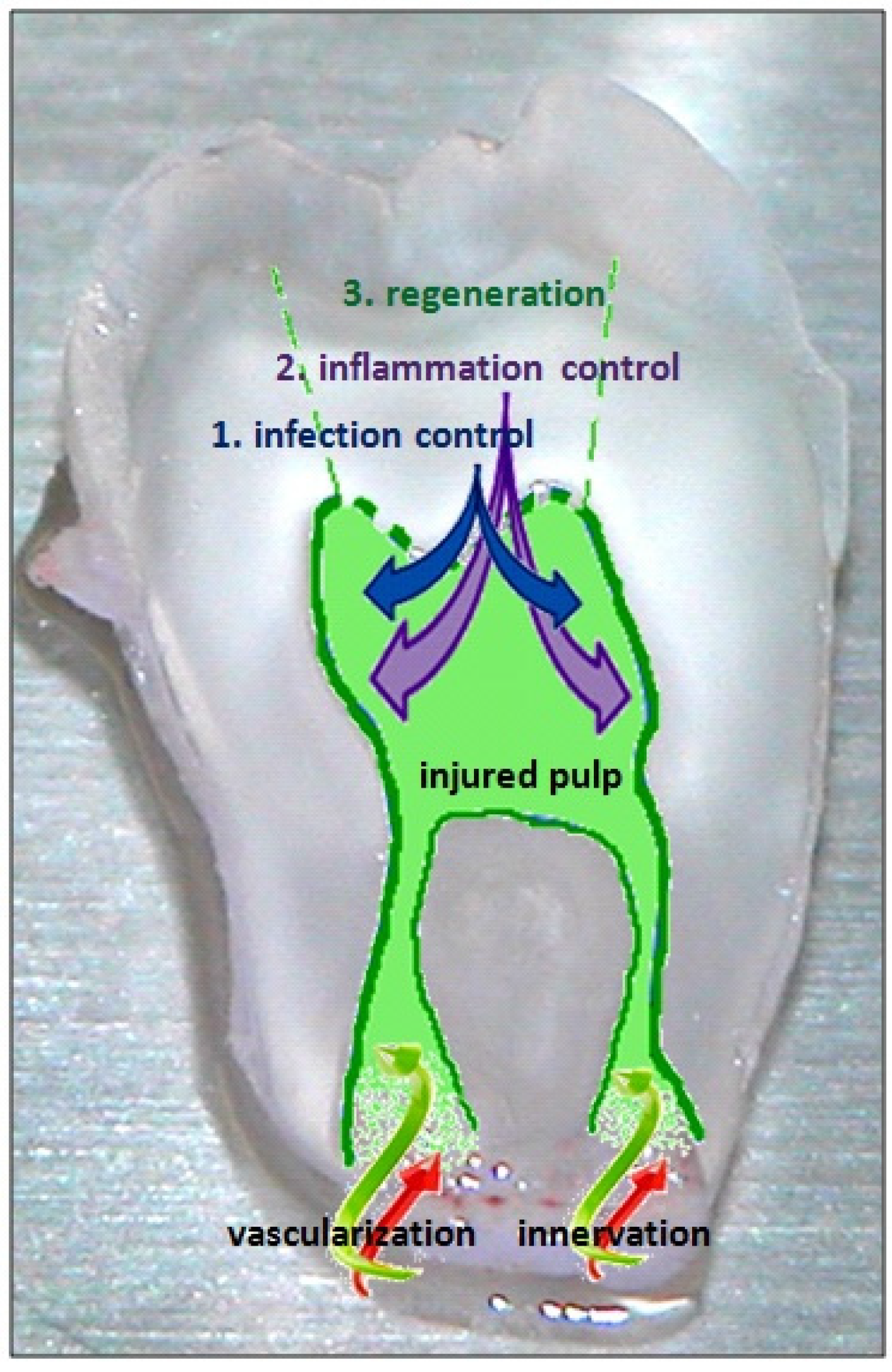 The three crucial steps of endodontic regeneration: (1) control of infection; (2) control of inflammation; and finally (3) regeneration of the injured pulp tissues: the type I collagen matrix with fibroblasts, innervation, vascularization and the odontoblast layer.