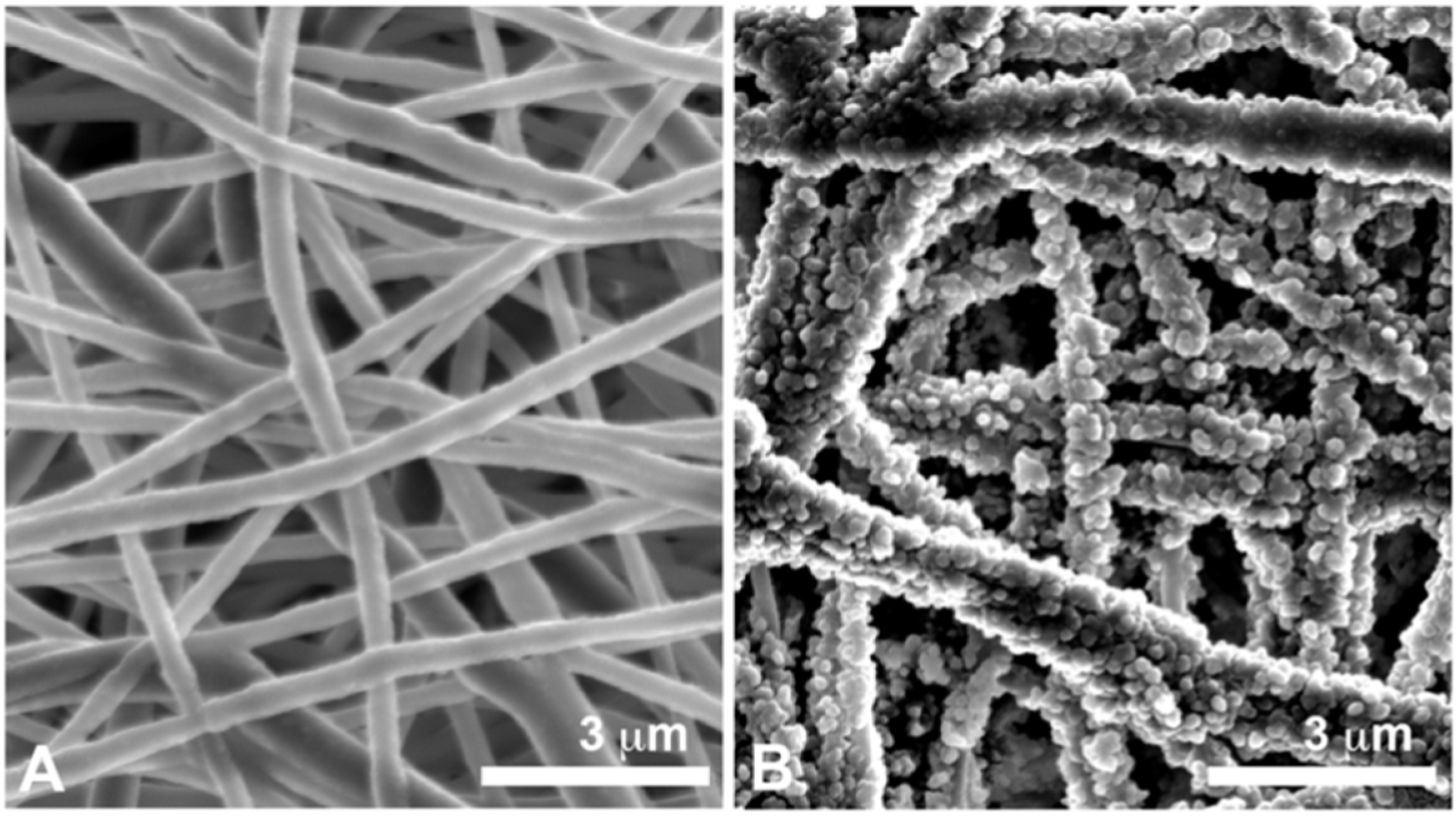 Scanning Electron Microscopy (SEM) observations. (A) Nanofibrous polycaprolactone membrane with an electrospun nanofiber network that mimics the pattern of the connective tissue matrix (B) Nanofibrous polycaprolactone membrane functionalized with nanoreservoirs of growth factors.