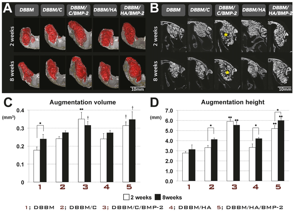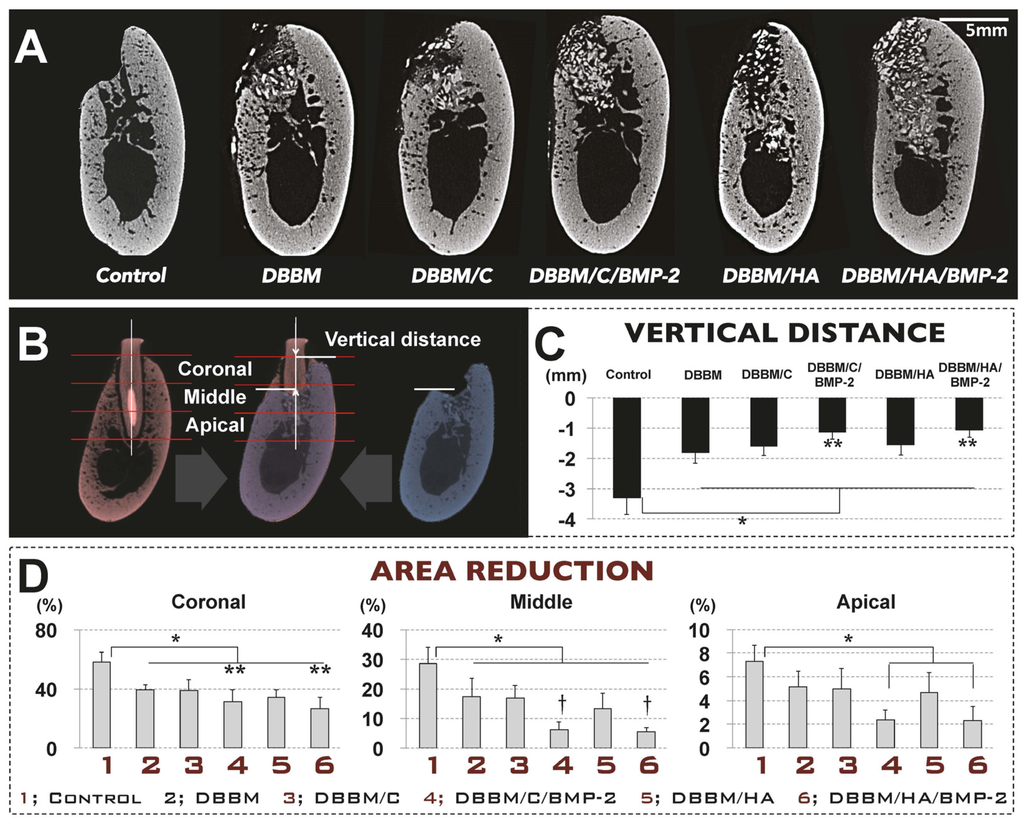 Alveolar ridge resorption following tooth extraction was observed in all groups, and was more pronounced in buccal and coronal regions than in the lingual and apical regions (Figure 5A). However, the reduction of the alveolar bone area and height in the fresh extraction socket was significantly decreased in all of the grafted groups compared to the control group (Figure 5C). In addition, dimensional alterations of alveolar ridge in DBBM/C/BMP-2 and DBBM/HA/BMP-2 groups were also significantly less than in the other grafted extraction-socket groups (i.e., the DBBM, DBBM/C and DBBM/HA groups) (Figure 5D).