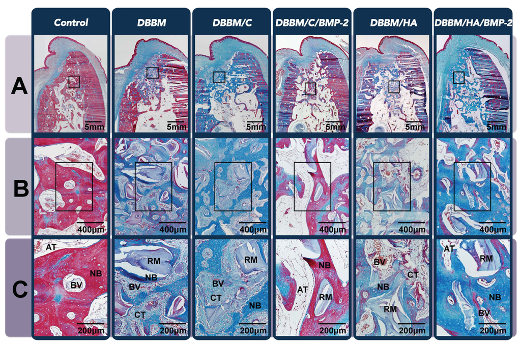 Histologic analysis of the beagle extraction-socket model. (A) Low-magnification image of the extraction site after eight weeks of healing (Masson’s trichrome staining, original magnification ×40, scale bar = 5 mm). While control sites showed a significant decrease in alveolar bone width at the coronal half of the dental root length, buccal bone plates at the other five grafted sites were in a higher position than at the control site; (B) Representative high-magnification view of the coronal region of the augmented area (Masson’s trichrome staining, original magnification ×100, scale bar = 400 μm); (C) A twofold-enlarged image in the center of (B) (Masson’s trichrome staining, magnification ×200, scale bar = 200 μm). Sites that received rhBMP-2 appeared to be in a more mature healing phase and showed higher proportions of adipose bone marrow tissue compared to the other three grafted sites, in which dense connective tissue could be found instead of adipose bone marrow tissue. DBBM, deproteinized bovine bone mineral; C, absorbable collagen sponge; BMP-2, bone morphogenetic protein-2; HA, hydroxyapatite-coated collagen; NB, newly formed bone; RM, residual material; AT, adipose tissue; BV, blood vessel; CT, connective tissue.