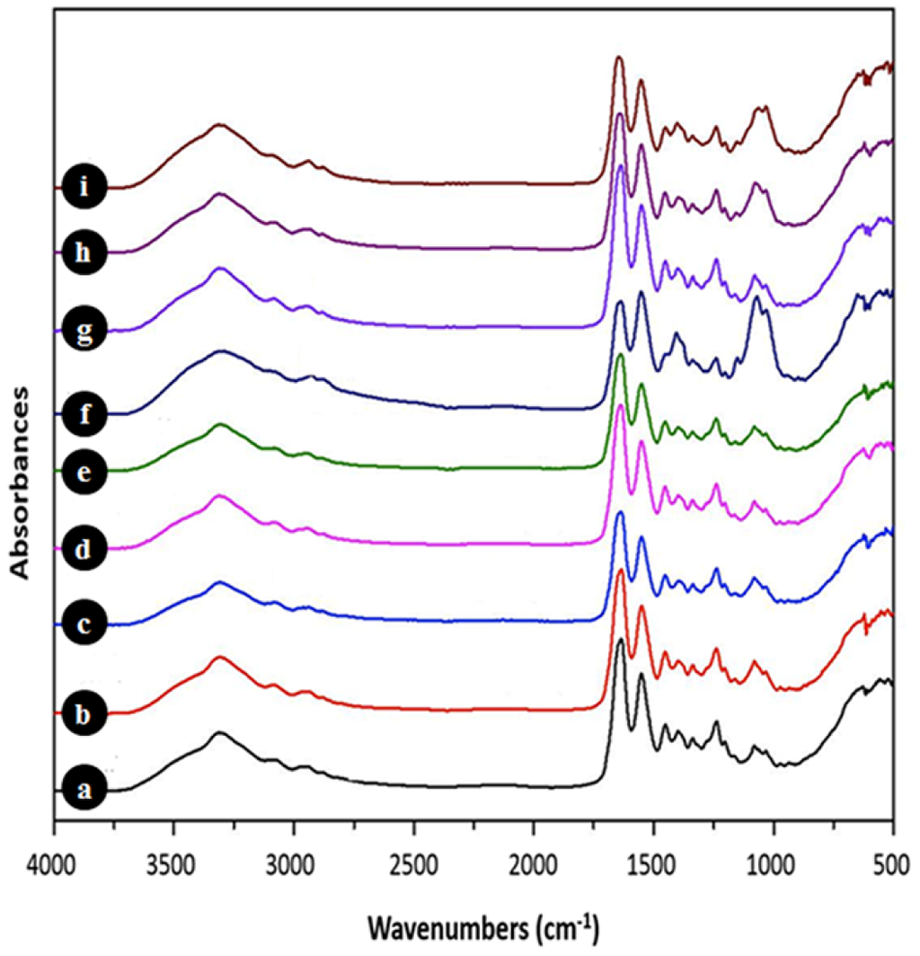 Protein composition of chitosan-coated collagen membranes. Following chitosan-coated collagen designed under various conditions, the produced membranes were subjected to Fourier transform infrared (FTIR) analyses. Spectra were obtained and plotted: (a) Unmodified collagen membrane, extensively washed (W); (b) 0.1% chitosan-coated collagen membrane, extensively W and non-crosslinked; (c) 1% chitosan-coated collagen membrane, non-W and non-crosslinked; (d) 0.1% chitosan-coated collagen membrane, crosslinked with glutaraldehyde (G) vapor and W; (e) 0.1% chitosan-coated collagen membrane, crosslinked with G vapor and non-W; (f) 1% chitosan-coated collagen membrane, non-W; (g) 1% chitosan-coated collagen membrane, extensively W; (h) 1% chitosan-coated collagen membrane, crosslinked with G and W; and (i) 1% chitosan-coated collagen membrane, crosslinked with G and non-W.