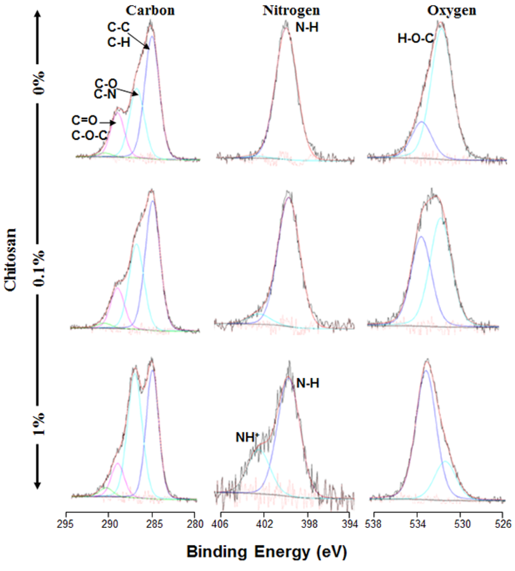 X-ray photoelectron spectroscopy (XPS) spectra of chitosan-coated collagen membranes. Materials with or without chitosan at various concentrations were synthesized and subjected to XPS analyses. Chemical composition spectra of the chitosan-coated and non-coated collagen membranes were compared (n = 4).