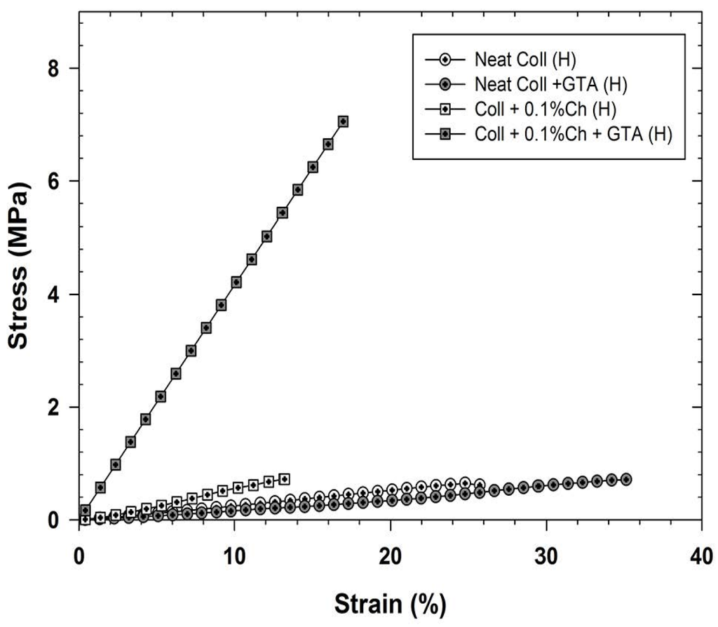 Stress-strain characterization of chitosan-coated and non-coated collagen membranes crosslinked with glutaraldehyde (GTA) vapor. Analyses were performed on dried membranes (n = 4). Ch: Chitosan.