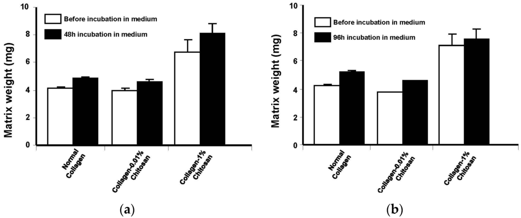 Weight lost of chitosan-coated collagen membrane following incubation with cell culture medium. Following the design of the different membranes, these were weighted at time zero. They were then immersed in culture medium and maintained at 37 °C for 48 and 96 h. At the end of each incubation period, membrane were washed with sterile water and dried for 4 days. The weight of each membrane was registered and compared to the initial one; n = 4. (a) Membrane weights at 48 h; (b) Membrane weights at 96 h.