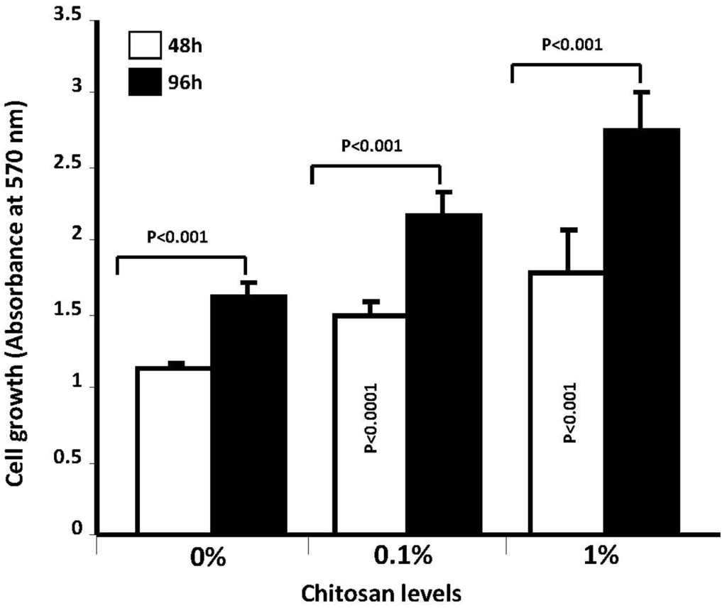 For this purpose, we performed a set of experiments to investigate cell adhesion onto/into these different membranes. As shown in Figure 7, the chondrocytes adhered to and spread well over the chitosan-coated collagen membranes and collagen membranes after 24 h of culture. Cell density was, however, higher in the 1% chitosan-coated collagen membranes than in the neat collagen membranes and 0.1% chitosan-coated collagen membranes. This supports the findings of Wang et al. (2015) who reported greater osteoblast adhesion to chitosan-collagen blend films [56]. Moreover, similar effects were obtained with adipose stem cells cultured onto poly(ε-caprolactone)-chitosan material [57]. The enhanced adhesion we showed may lead to cell growth. As shown in Figure 8, the quantitative data on chondrocyte proliferation (MTT) confirm the cyto-compatibility of glutaraldehyde-crosslinked chitosan-coated collagen membranes. Of interest is the high metabolic activity of the chondrocytes seeded on the chitosan-coated collagen membranes compared to that observed on the neat collagen membranes. This effect was observed at different culture periods (48 and 96 h). In addition, the greater the chitosan level, the higher the metabolic activity (Figure 8). Due to the pore size ranging between 20 and 50 μm in out designed membranes, it is more likely that the cells adhered and grew on the surface of each chitosan-coated membrane. Although, with 50 μm pore size, chondrocytes may get into, adhere and proliferate because the chondrocyte size is estimated to be from 10 to 40 μm. To confirm the effect of chitosan coated collagen membrane on cell adhesion and metabolic activity, we performed a cell viability assay using trypan bleu exclusion. As presented in Figure 9, the total live cells obtained with chitosan-coated collagen membranes were higher as compared to the control (simple collagen membranes). Indeed, after 48 h culture, the number of live cells obtained with neat collagen was about 106 while with chitosan-coated collagen membranes we got over 5 × 106 demonstrating that the chitosan-collagen membranes promoted chondrocyte proliferation. The same effect was obtained after 96 h culture, with greater live cell numbers with the chitosan-coated membrane as compared to collagen membranes (Figure 9). This study supports those reporting beneficial uses of collagen/chitosan scaffolds in the culture of endothelial cells, fibroblasts, mesenchymal stem cells, nerve cells, and chondrocytes [58,59,60,61,62].