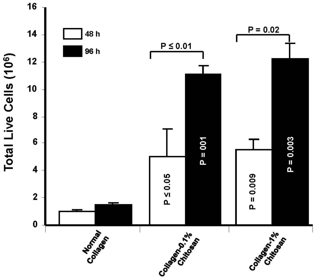 Level of live chondrocytes following growth on chitosan-coated collagen membranes. Chondrocytes were seeded onto the membranes and culture for 48 and 96 h. At the end of each culture period, cells were detached and the live cells were determined using trypan bleu exclusion assay; n = 3.