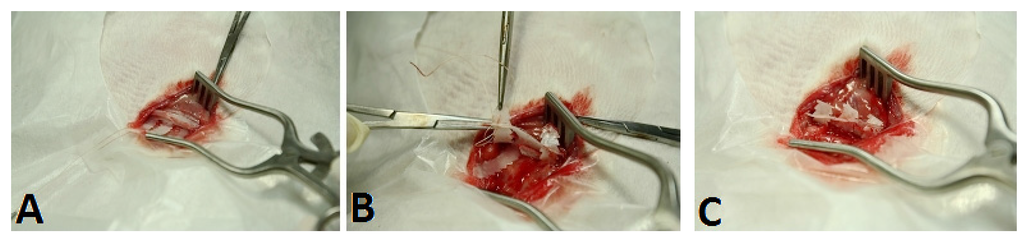 The tested specimens were then randomly divided into two groups to be fixed either by a titanium miniplate (Ti group) (Synthes, Paoli, PA, USA) or the PCL fixator (PCL group). In the Ti group, a four-hole, 0.5 mm thick, and 15 mm long titanium plate was used, with two holes at each end of the fracture site (Figure 2A). The matching titanium screws had a core diameter of 1.3 mm. Meanwhile, in the PCL group, one belt at each end of the fracture site was attached and another was just passed around the fracture site. All three belts were pulled and tightened after entering the matching holes (Figure 2B). After fixation, the implant-rib composites were reexamined under the same parameters as the three-point bending test.