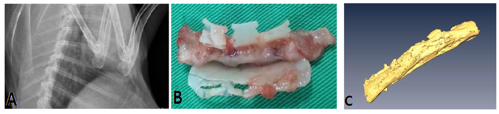 Six osteotomized ribs from the six New Zealand rabbits were fixed with the PCL fixators. Monthly follow-up X-rays showed the fracture sites were secured and there was no displacement of the osteotomized ribs under fixation. All rabbits survived the surgery; they were sacrificed 12 weeks post-operatively, and the specimens were obtained. All fractured ribs were united grossly (Figure 5A,B). Three-dimensional micro-CT showed excellent bone continuity and callus formation (Figure 5C).