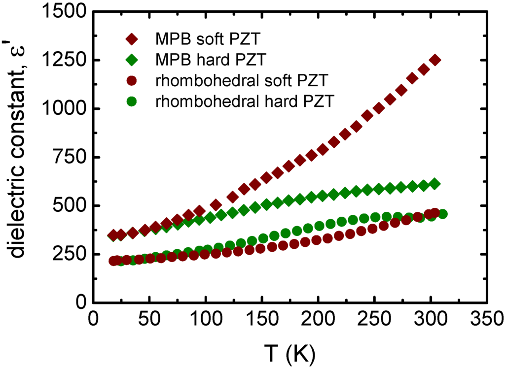 Temperature dependent dielectric constant for Pb(Zr0.60Ti0.40)O3 (rhombohedral PZT) and Pb(Zr0.53Ti0.47)O3 (MPB PZT) doped with Nb5+ (soft PZT) or Fe3+ (hard PZT) from low temperatures to above room temperature. The data were extracted from the reference [35] (Copyright AIP Publishing LLC., 2007).