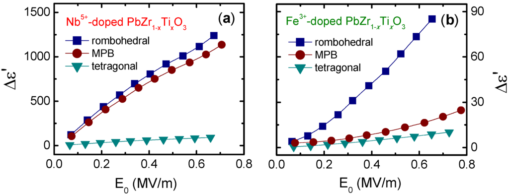 Figure 2 shows the increments of the dielectric constant for Nb- and Fe-doped Pb(Zr0.60Ti0.40)O3 (rhombohedral PZT), Pb(Zr0.53Ti0.47)O3 (MPB PZT) and Pb(Zr0.40Ti0.60)O3 (tetragonal PZT). Here, Δε is calculated from the D(E) response according to the procedure detailed in [36]. As can be observed, the nonlinear response also depends on the crystal structure and the dopant, and is larger in the rhombohedral composition doped with donor ions. These correlations are discussed below.