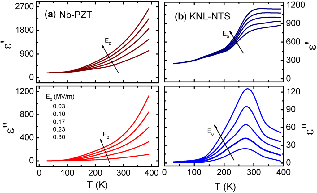 Temperature dependence of real, ε′, and imaginary, ε″, components of the relative dielectric permittivity at 1 kHz as a function of the amplitude of the applied electric field for (a) lead-based Nb-doped Pb(Zr0.60Ti0.40)O3 (Nb-PZT) and (b) lead-free (K0.44Na0.52Li0.04)(Nb0.86Ta0.10Sb0.06)O3 (KNL-NTS). The data were partially extracted from the reference [38] (Copyright AIP Publishing LCC., 2012).