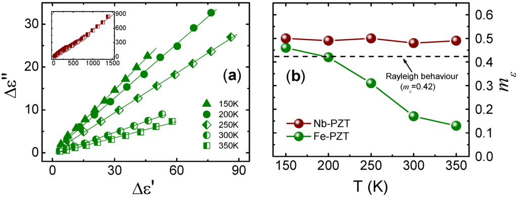 The mε value as a function of the temperature is shown in Figure 4b for both Fe-doped and Nb-doped Pb(Zr0.60Ti0.40)O3. Note that the mε value remains almost constant for Nb-PZT, while an evolution towards lower values is observed for Fe-PZT. In terms of the Rayleigh model, the mε values for Nb-doped PZT appear to be slightly higher than those expected, thereby revealing the presence of some dissipative processes that have not been taken into account by the model; i.e., processes in which the losses contribute more than that predicted by the Equation (3). Field-induced phenomena, e.g., conductivity effects, may account for the obtained additional dissipation in this material. In any case, and based on the Rayleigh law, the contribution of the irreversible displacement of domain walls appear to be the mechanisms governing the Nb-PZT response for all temperatures. On the other hand, the dielectric response fits the Rayleigh model only for T = 200 K in Fe-PZT, thereby showing that the relevant mechanisms governing the dielectric response differ according to the temperature. In this material, there appears to exist a reversible (elastic) domain wall motion mechanism contributing to the dielectric constant, but which has no associated losses [40].