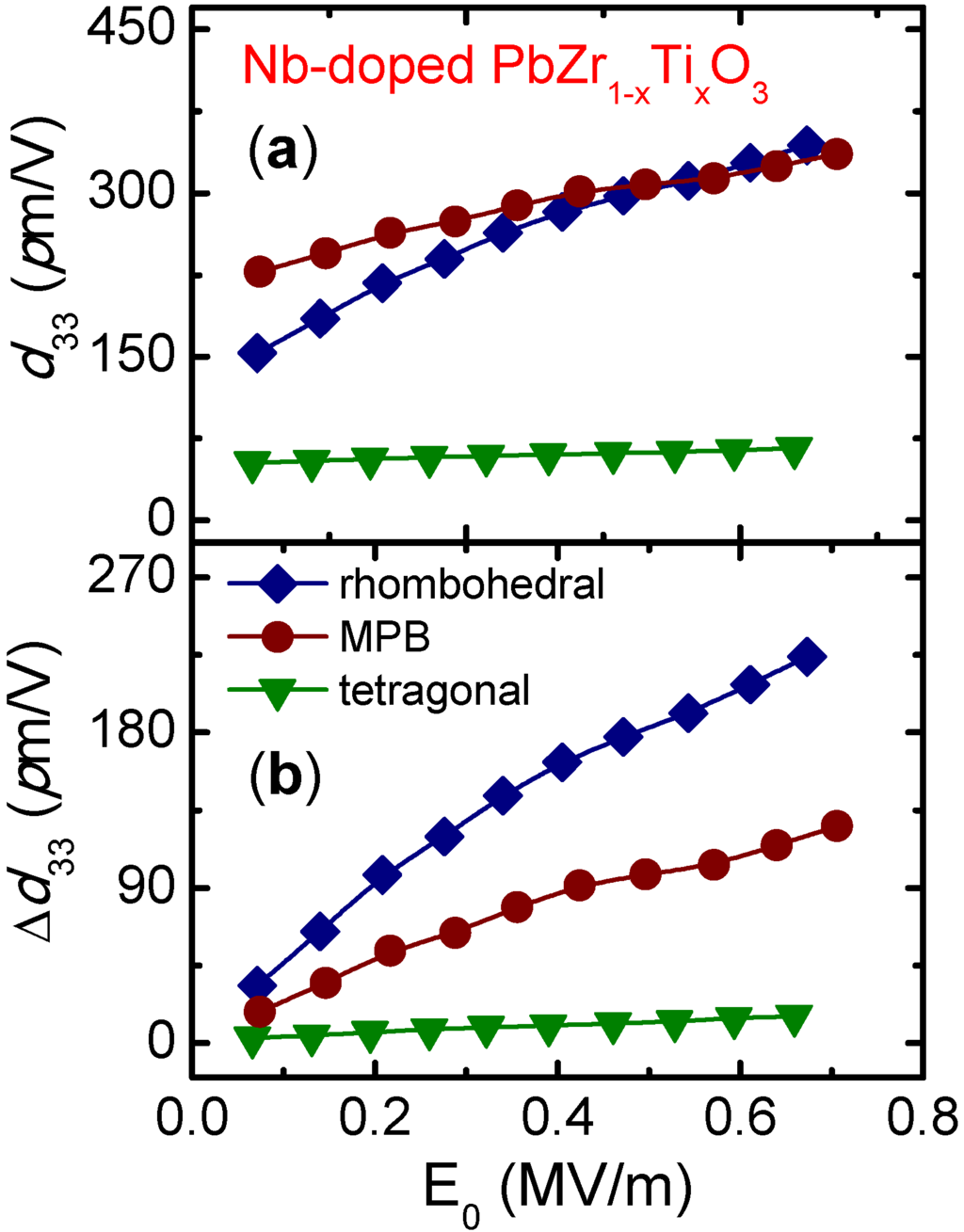 (a) Total value and (b) increment of the converse piezoelectric coefficient as a function of the applied electric field amplitude for Nb-doped Pb(Zr1−xTix)O3 with x = 0.40 (rhombohedral), 0.47 (MPB) and 0.60 (tetragonal). The data were extracted from the reference [26] (Copyright AIP Publishing LCC., 2008).
