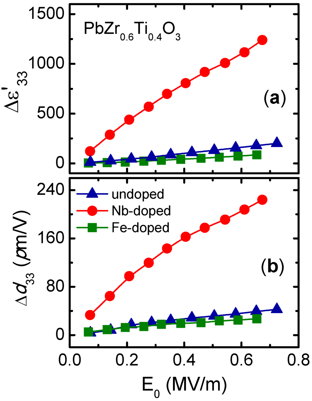 Increments in (a) the dielectric constant and (b) the converse piezoelectric coefficient as a function of the applied electric field amplitude for undoped, Nb-doped, and Fe-doped Pb(Zr0.60Ti0.40)O3. The data were extracted from the reference [26] (Copyright AIP Publishing LCC., 2008).