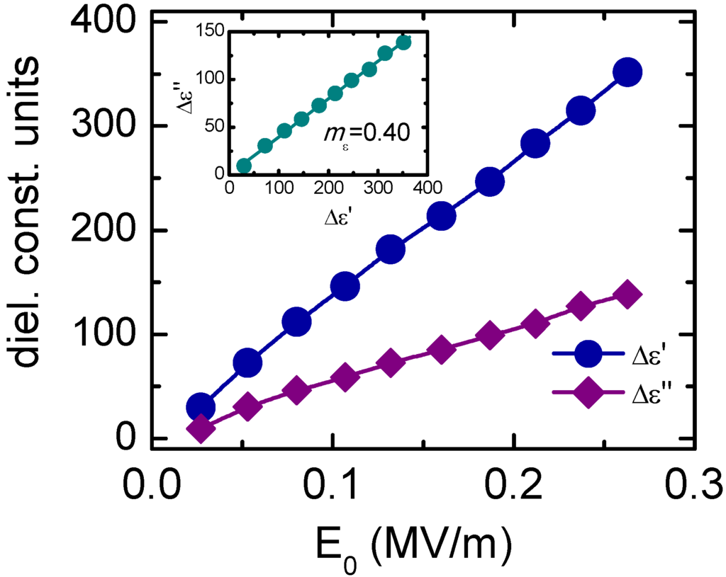Increments of the real (Δε′) and imaginary (Δε″) parts of the relative permittivity for KNL-NTS at room temperature. The inset shows the relation between Δε″ and Δε′, and the ratio mε = Δε″/ Δε′ is reported. Figure reprinted from reference [30] (Copyright IOP Publishing Ltd., 2009).