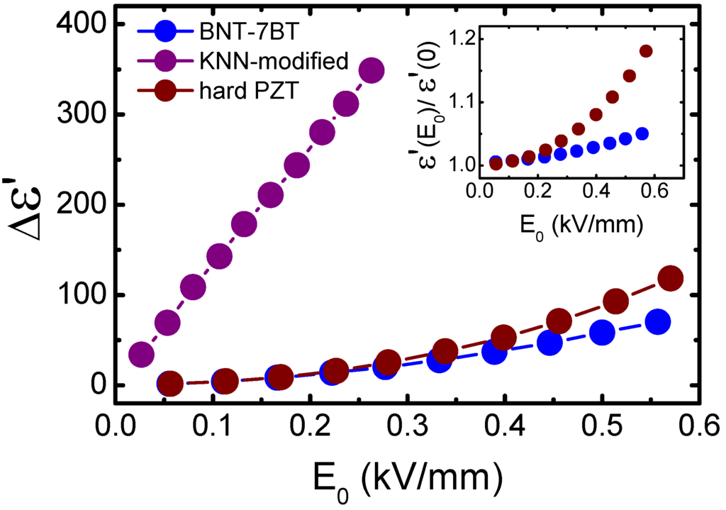 Increments of the dielectric constant as a function of the applied electric field amplitude for (K0.44Na0.52Li0.04)(Nb0.86Ta0.10Sb0.04)O3 (KNN-modified), 0.93(Bi0.5Na0.5)TiO3–0.07BaTiO3 (BNT-7BT) and Pz26 (hard commercial PZT, from Ferroperm). The inset shows the relative increment of the dielectric constant for BNT-7BT and hard PZT.
