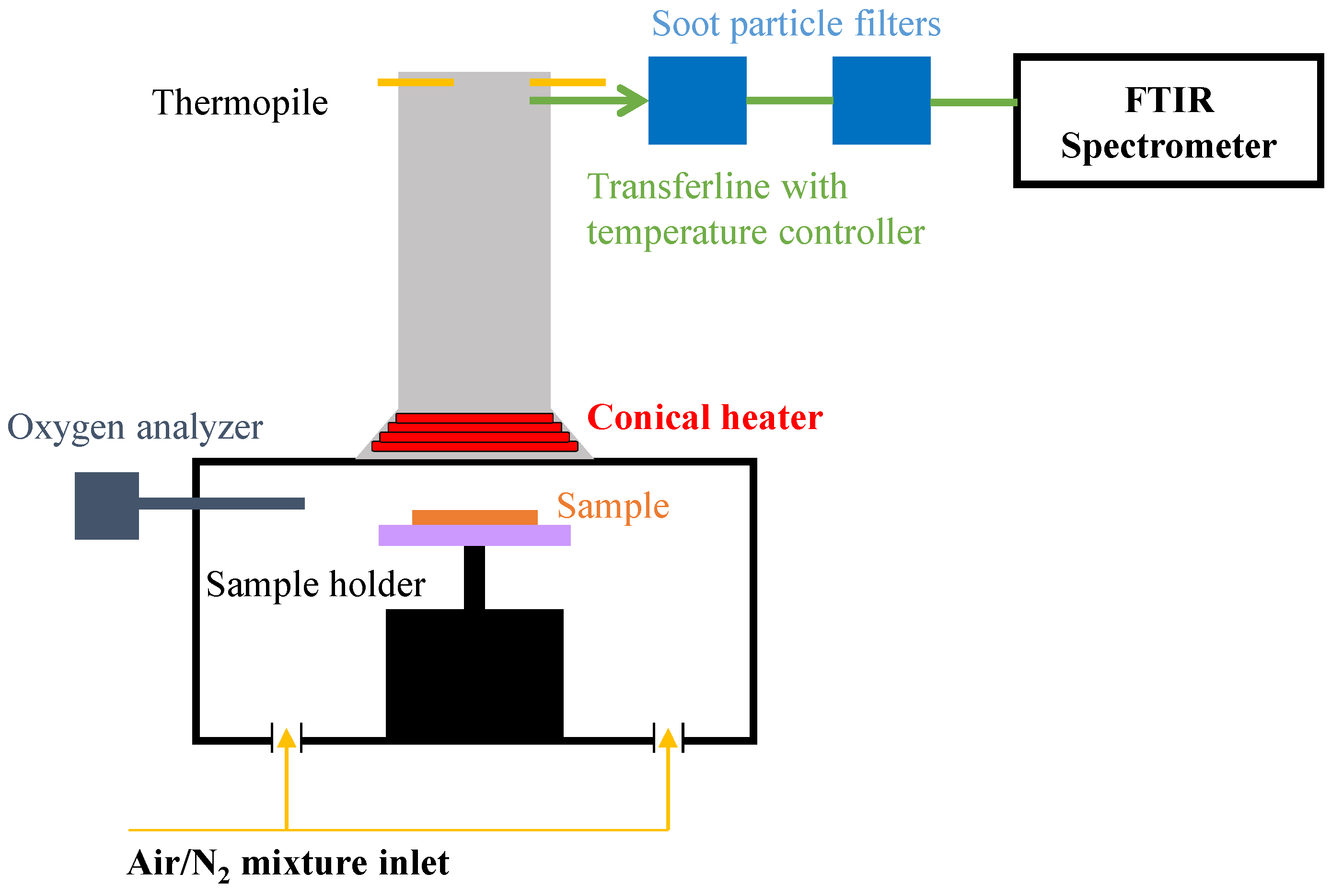 To investigate the gases released during CAMLC experiments, the CAMLC apparatus was connected to a Fourier Transform Infra-Red (FTIR) spectrometer (CAMLC-FTIR) as shown in Figure 2. Using this device, released gases are analyzed online quantitatively and qualitatively. Gas picking pistol and transfer lines were provided by the M&C Tech Group; FTIR, Antaris™ Industrial Gas System, was provided by ThermoFisher Scientific. The transfer line between CAMLC and FTIR is 2 m long and was heated at 180 °C. To insure a constant temperature of the transfer line, two temperature controllers were installed. Before analyzing the gases by FTIR, soot particles were filtered off by two different heated filters (2 and 0.1 µm) that consist of glass fibers and ceramic, respectively. The FTIR gas cell was set to 185 °C and 652 Torr. The optical pathway is 2 m long and the chamber of the spectrometer is filled with dry air. FTIR spectra obtained using CAMLC-FTIR were treated using OMNIC™ software. To quantify gases, spectra have to be recorded at different concentrations for targeted gases and a quantification method has to be created using TQ™ Analyst software. To create a method, representative regions in the spectra of the selected gas have to be chosen and interactions with other gases have to be taken into account. Using CAMLC-FTIR the following gases can be quantified: water, carbon monoxide, carbon dioxide, acetic acid, acetone, methane, propane, ethane, and ethene. The developed method in our laboratory can also consider nitrogen monoxide, nitrogen dioxide, hydrogen cyanide, ammonia, and ethyne. Quantification is reproducible within ±10 %. CAMLC-FTIR experiments were performed in duplicate to ensure repeatability of the obtained results.