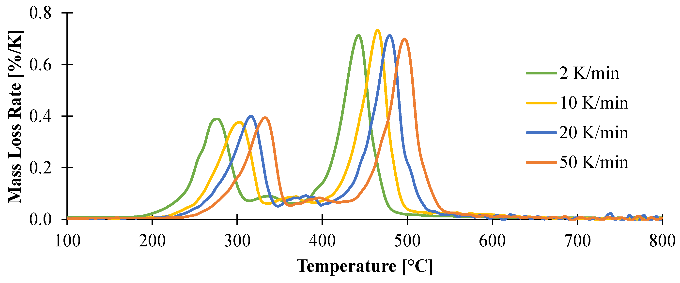 Mass loss rate collected in TGA experiments carried out in nitrogen at a heating rates of 2, 10, 20, and 50 K/min.