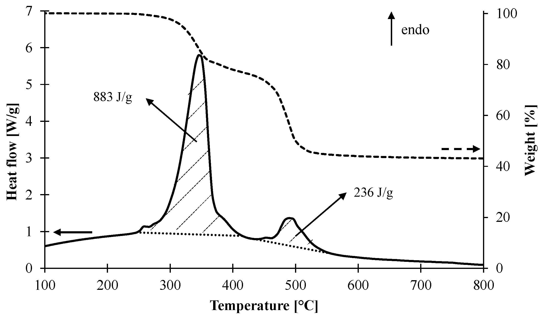 DSC signal of the decomposition of EVA/ATH (straight line) and TG signal (dotted line).