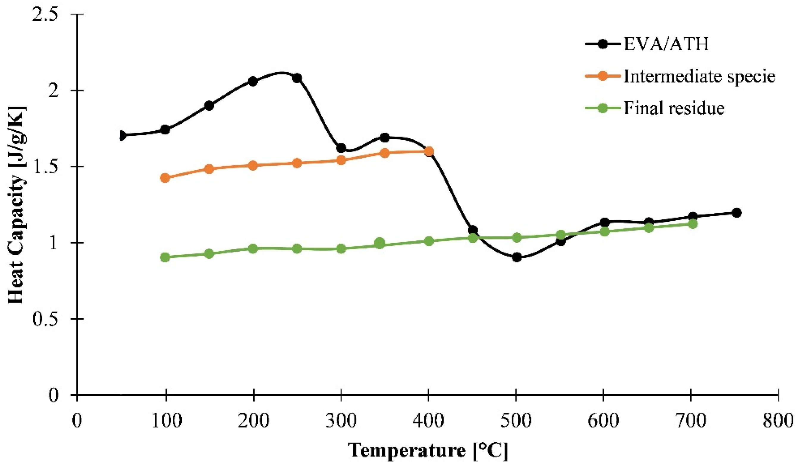 The first part of this work aims at investigating and developing several methods to evaluate the thermo-physical properties of EVA/ATH as a function of temperature. The decomposition of EVA and ATH is well described in the literature [32,39,40,41,42,43]: EVA starts to degrade under inert atmosphere around 300 °C in two steps, first releasing acetic acid and then hydrocarbons at around 450 °C. ATH dehydrates around 220 °C, releasing water and forming a ceramic residue made of alumina (Al2O3). In this study, the different decomposition (Figure 3) products will be defined as follows: