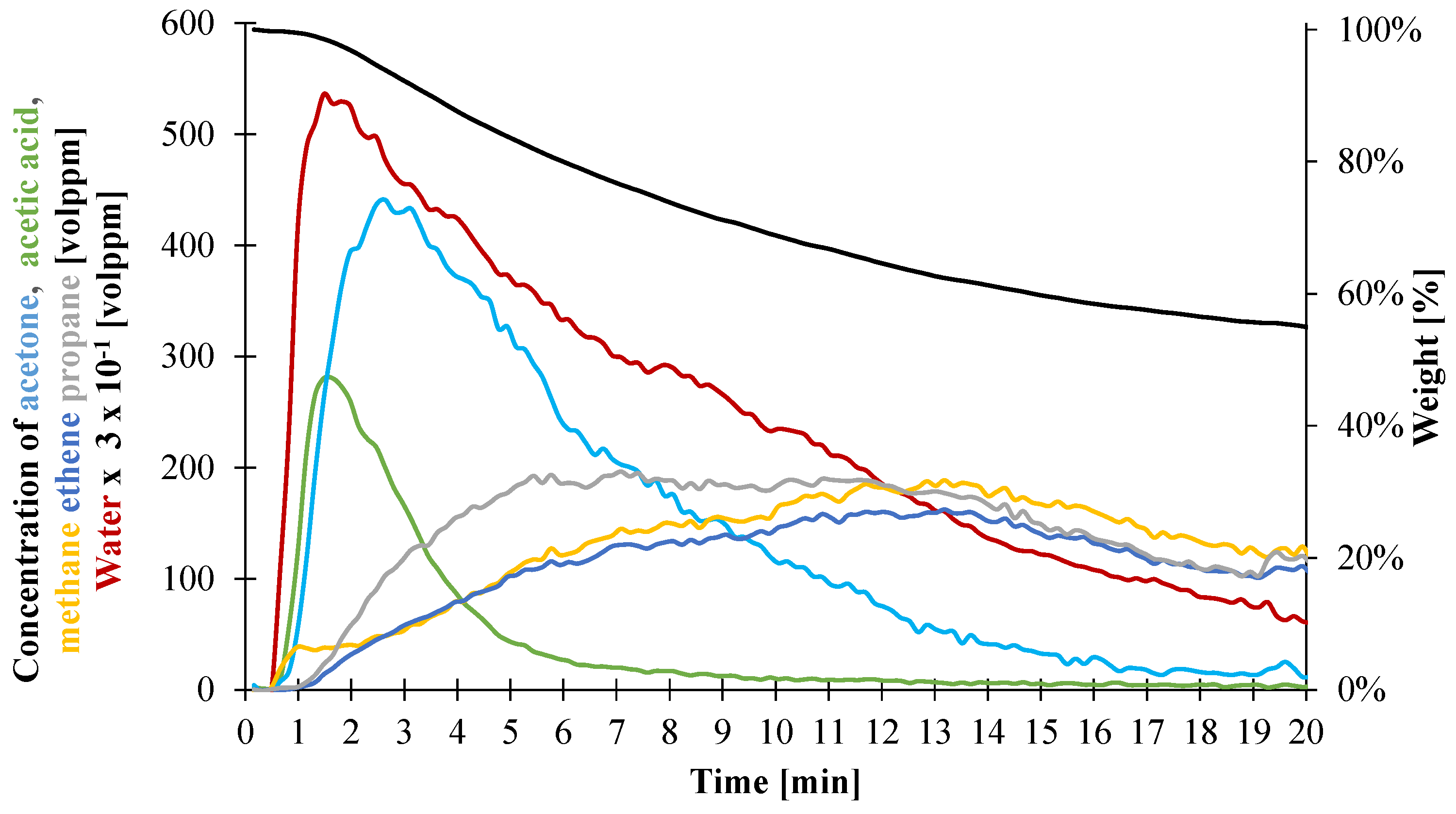 - Gas1 refers to the water released during the decomposition of ATH into alumina, and acetic acid from the deacetylation of the EVA.