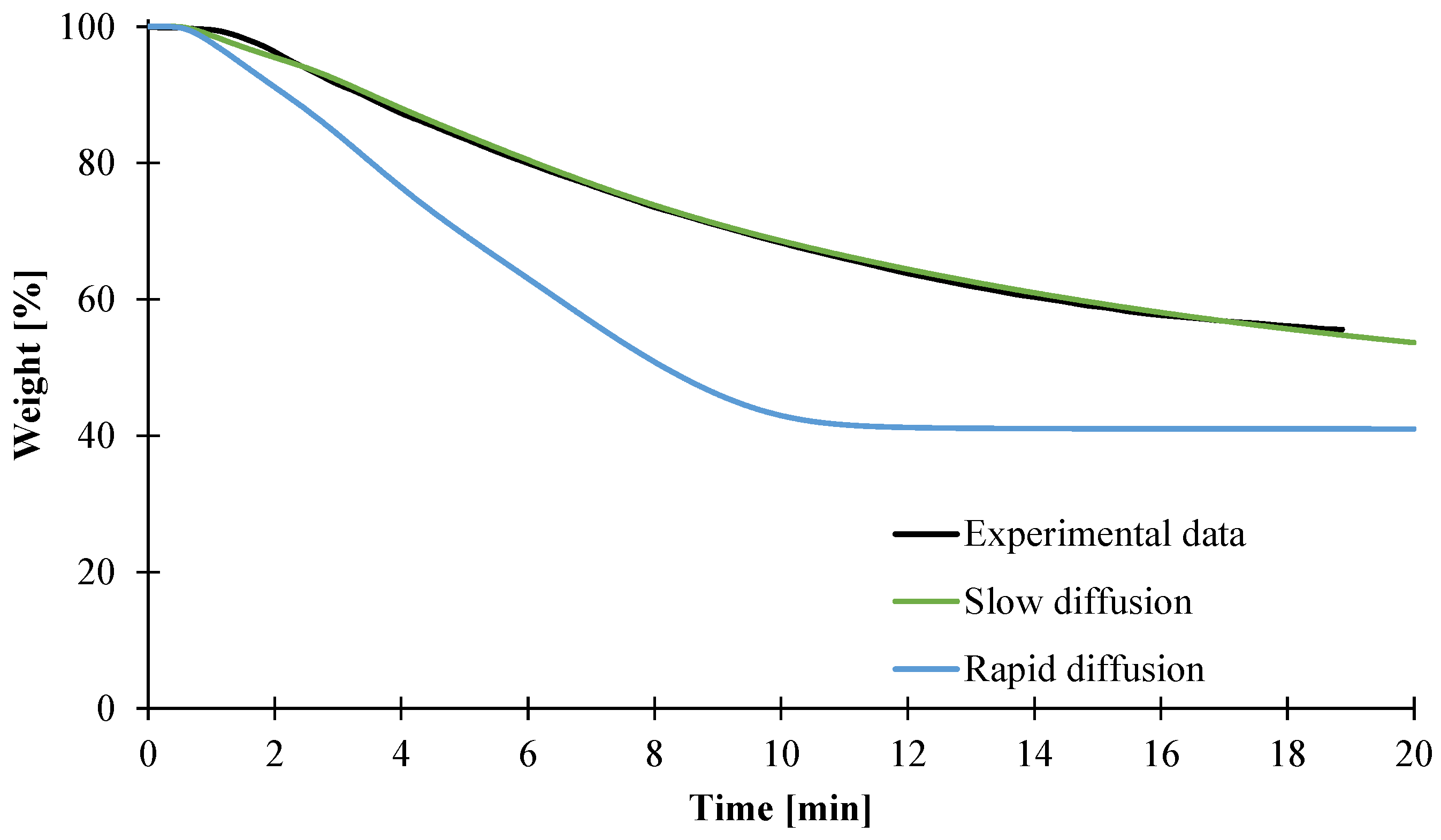 Experimental and predicted gas release assuming slow or rapid diffusion of gases.