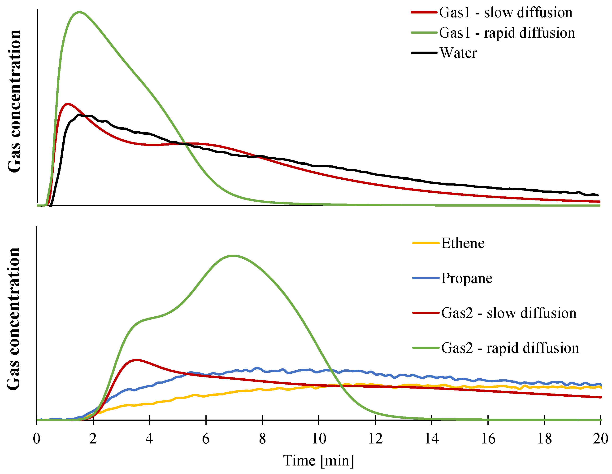 As described previously, it is possible to collect temporally resolved gas concentration profiles during CAMLC-FTIR experiments. Two main gases are evolved: Gas1, which corresponds to approximately 95% of water, and Gas2, which correspond to hydrocarbon compounds. The mass flux of both Gas1 and Gas2 have thus been simulated assuming either rapid diffusion using a mass transfer coefficient of 2 × 10−5 m²/s or assuming slow diffusion as defined previously, and results are presented in Figure 17. They show that the release of the decomposition products is well predicted using the assumption of slow diffusion of the gases. Indeed, with a high Dgas value, Gas1 exhibited a peak of release around 2 min, but too much of the gases is released and no more water is released after 6 min. The difference between the experimental and predicted time to peak can be attributed to the acquisition time of the FTIR spectrum (one spectra consists of 20 scans). The prediction of the release of hydrocarbon compounds is also significantly improved when assuming a slow release of gases. Indeed, the rate of release of Gas2 is close to these of ethene and propane until 6 min. Fitting the experimental gases that are the most representative of the gaseous component inside the model (water for Gas1 and ethene, propane or methane for Gas2) validates the change of mass transfer coefficient for these two gases.