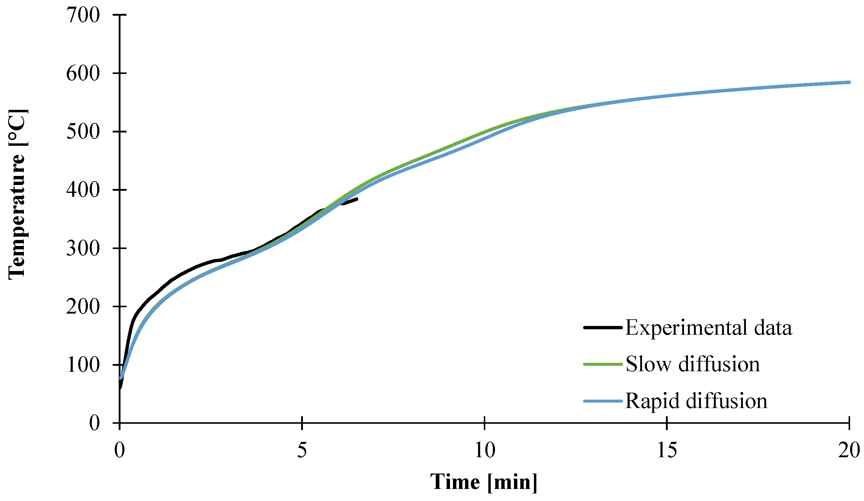 At the exception of the mass transfer coefficient, all the input data have been measured as shown previously. In order to validate these data (including Dgas values), the temperature profile at the backside of the plaque was predicted using the model and compared with experimental data in the case of the slow diffusion of decomposition gases as well as the fast diffusion (high Dgas values). Note that only the first six minutes of the experiment data are presented, as the thermocouples molded at the backside were not retained anymore after that time. As shown in Figure 18, a good agreement between predicted and experimental data is obtained assuming slow diffusion but also fast release of gases. Before 5 min, both predicted temperature curves are similar. Also, after the 12 min experiment, when the temperature reaches a plateau around 580 °C, the prediction shows a difference of less than one degree Kelvin. Between 5 and 12 min, the predicted temperature curve assuming slow diffusion is 10 °C higher than if assuming fast release of the gases.